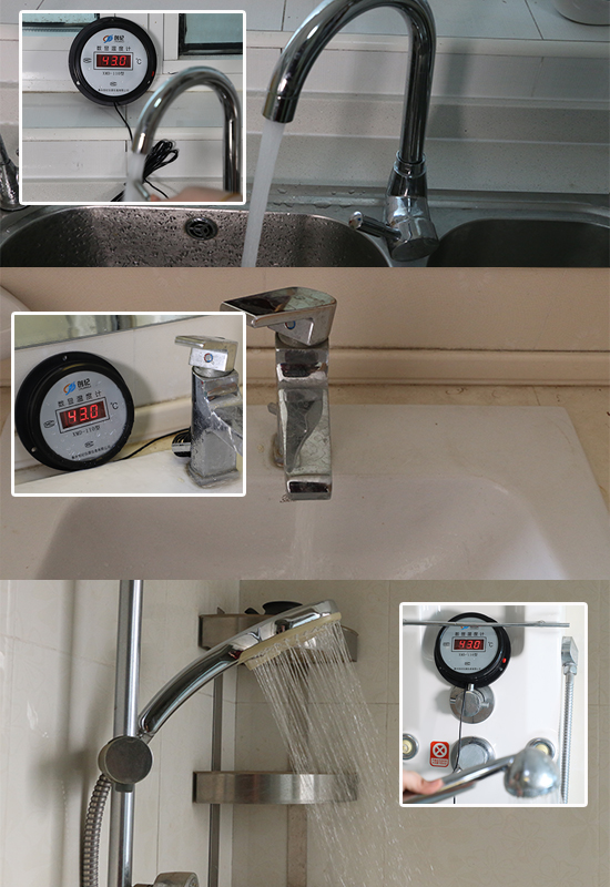 家中日常用水一般都至少兩三個用水點,那么這款燃氣熱水器可以滿足家中多用水點的熱水供應(yīng)嗎?為測試出水點的溫度,我們把家中廚房水龍頭、盥洗間水龍頭、淋浴噴頭同時開。
